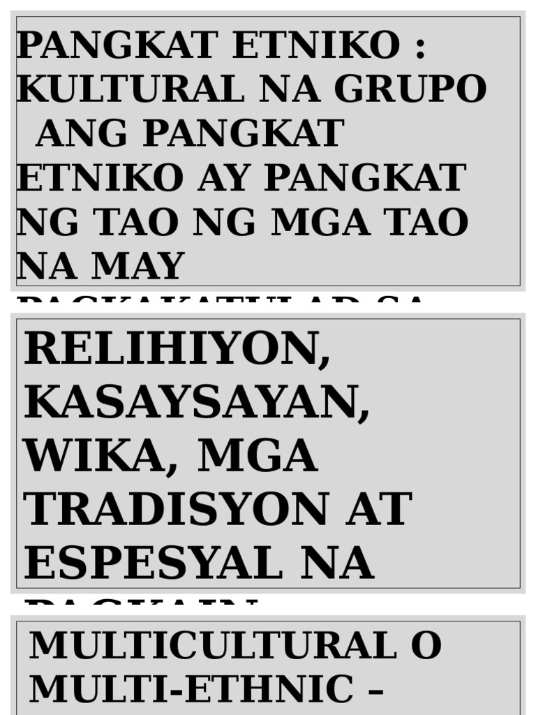 Wika - Bilang kaluluwa ng isang kultura Relihiyon - Sistema ng paniniwala at ritwal Lahi - Pagkakakilanlang bayolohikal ng pangkat ng tao Pangkat - Etniko - pangkat ng. This quiz is incomplete.