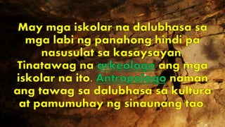 Natutunan ng mga sinaunang Pilipino ang paggamit ng mga kasangkapang yari bato. Isang paglalarawan ng mga taong namumuhay noong Panahon ng Bato. Antas ng katayuan noon maginoo o maharlika o alipin angkan ng timawa datu pinakamataas sa ikalawa o pinakamababang lipunan panggitnang uri mayayaman antas nabibili at makapangyarihan malaya naipagbibili kinabibilangan ng mandirigma walang karapatan mga datusultan mangangalakal walang sariling karaniwang bahay mamamayan 1.